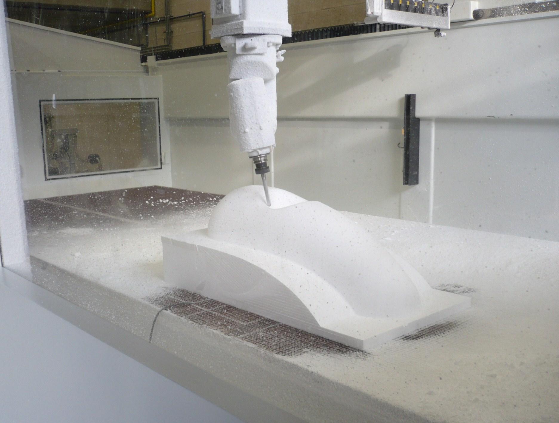 Pour réaliser le modèle de la carrosserie, nous avons choisi de faire confiance à l’expertise de Monsieur Robert Crets, directeur de la société Advanced Composite Milling, qui dispose d’une fraiseuse numérique 5 axes d’une longueur en X de 6000mm, d’une largeur en Y de 2600mm et d’une hauteur en Z de 1200mm. Elle correspond à notre application car nous devons usiner des pièces d’un peu plus de 3m de long sur 70cm de large et 55 de haut.