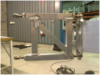 Une fois les longerons assemblés venait le moment de nous occuper de la direction. Nous avons commencé par découper carrés et tubes, nous les avons percés, ébavurés et enfin taraudés afin de pouvoir y fixer les rotules. Une fois toutes ces opérations terminées nous les avons mis en place avec des serre joint et nous les avons soudés.
