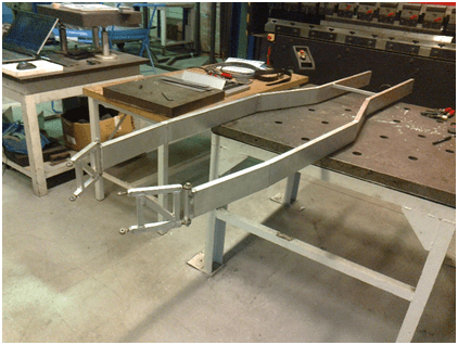 Une fois de plus, nous avons pu compter sur l’aide de notre partenaire Technifutur, et plus précisément de celle de Jean Luc Diefels et de son équipe de formateurs pour nous aider à réaliser le travail. Nous avons commencé par cintrer les longerons afin qu’ils aient exactement la forme voulue. Pour ce faire nous avons réalisé très précisément un gabarit en bois pour obliger les profilés à suivre la forme désirée. Une fois le gabarit terminé nous avons disqué, cintré et fixé les tubes suivant la forme du gabarit. Ensuite, avec l’aide d’un formateur en soudage, les profilés ont été assemblés par TIG. Une fois les deux longerons soudés nous les avons solidarisés en soudant une traverse provisoire afin que l’écart entre les deux tubes reste correct