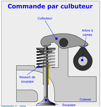 Et utilise une commande de soupape dite par basculeurs, ou culbuteurs.