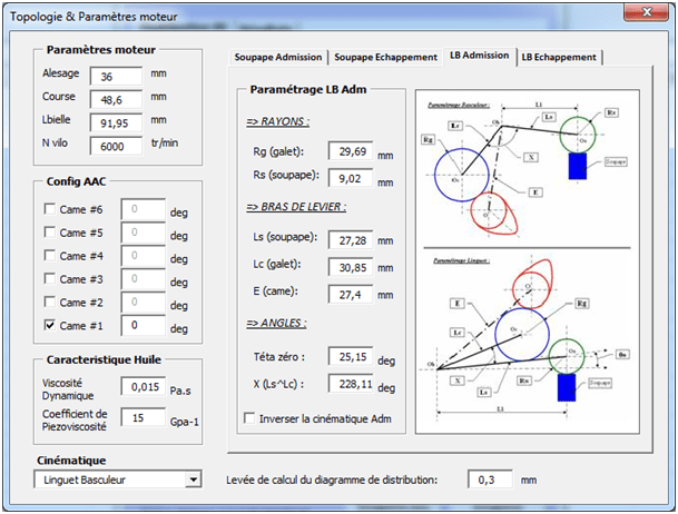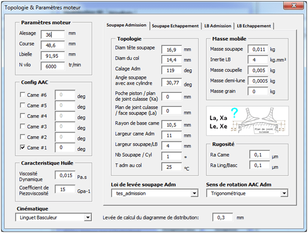 Pour cela il faut renseigner les caractéristiques de topologie du moteur, des matériaux et des ressorts de soupapes utilisés: