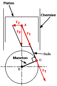FP est la force exercée par le piston verticalement. Or, en fonction de l’angle de rotation du vilebrequin, la bielle n’est pas constamment alignée verticalement avec l’axe du cylindre, donc la force FP peut se décomposer en F1 et F2.