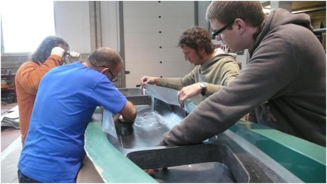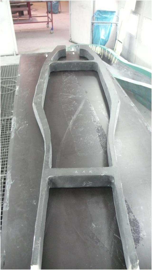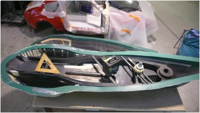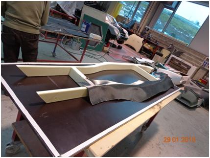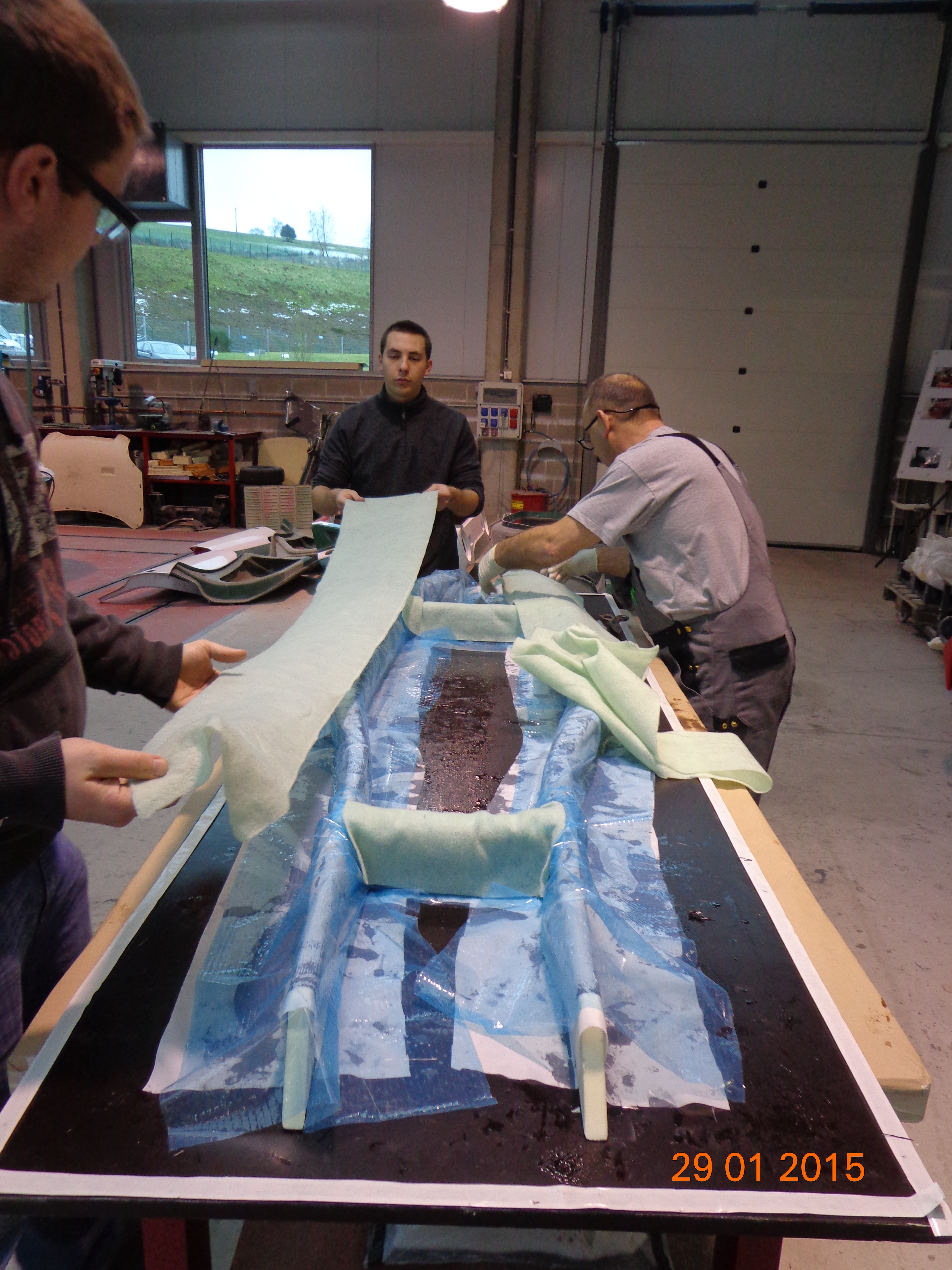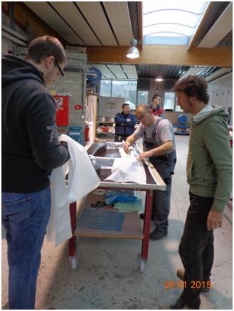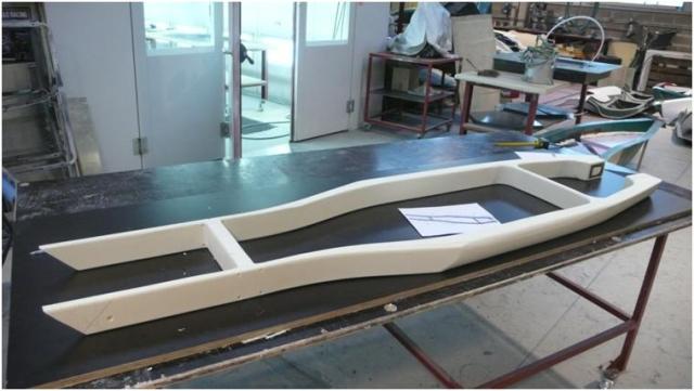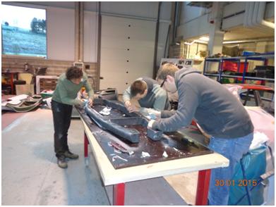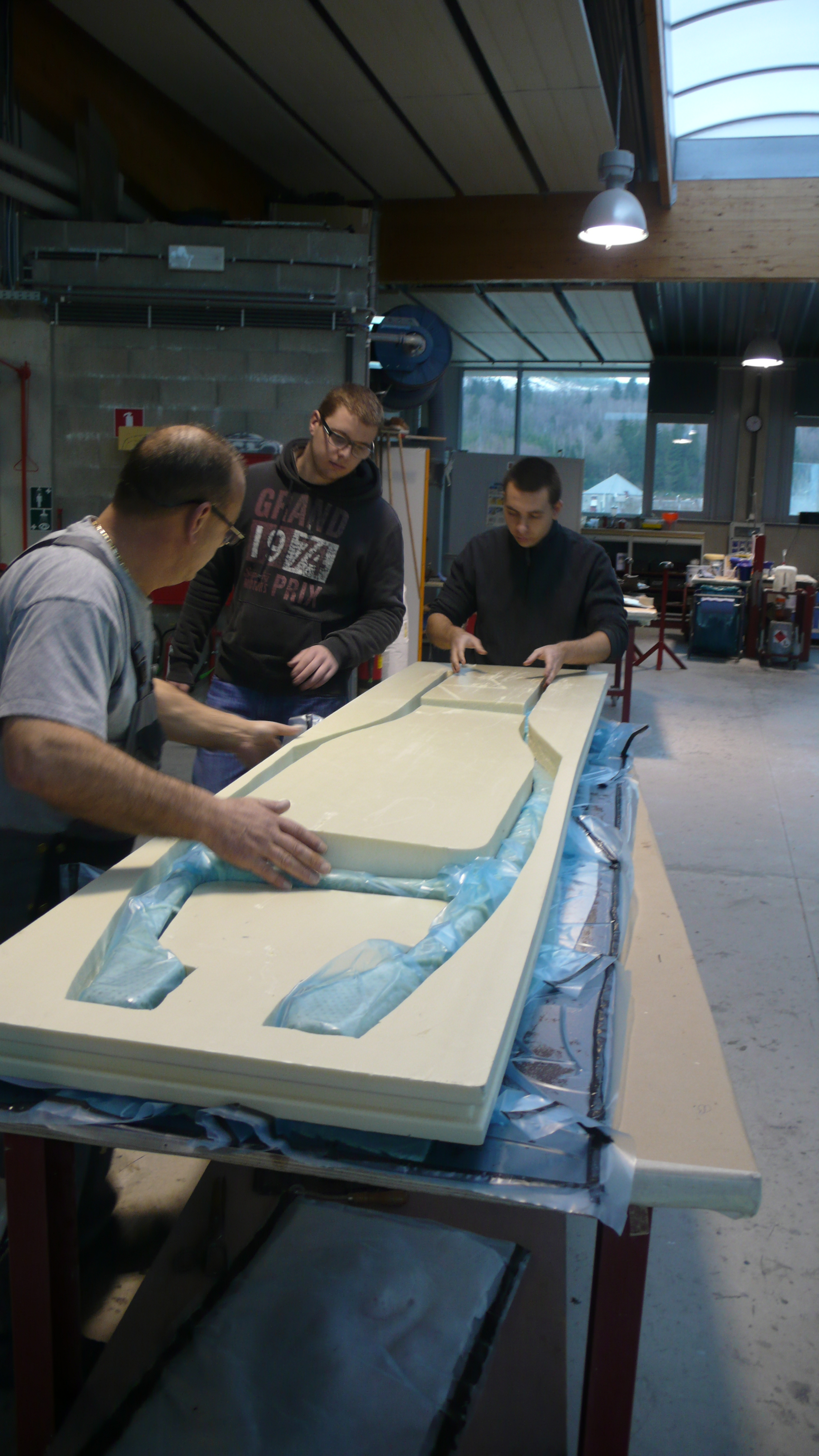Comme nous l’indiquions dans un précédent article (https://team-ecomotion.com/2014/12/27/nouveau-chassis-en-sandwich-composite-etape-1-la-conception/ ), le châssis consistera en une peau de carbone laminée sur un squelette en mousse PU. Une fois solidifiée, cette structure sera collée à la coque inférieure afin qu’elle participe à la rigidité de l’ensemble.