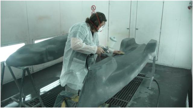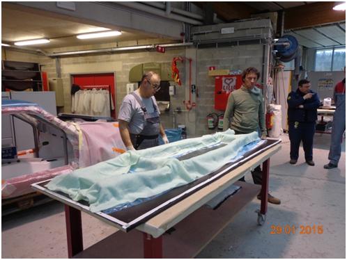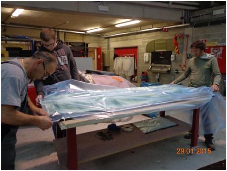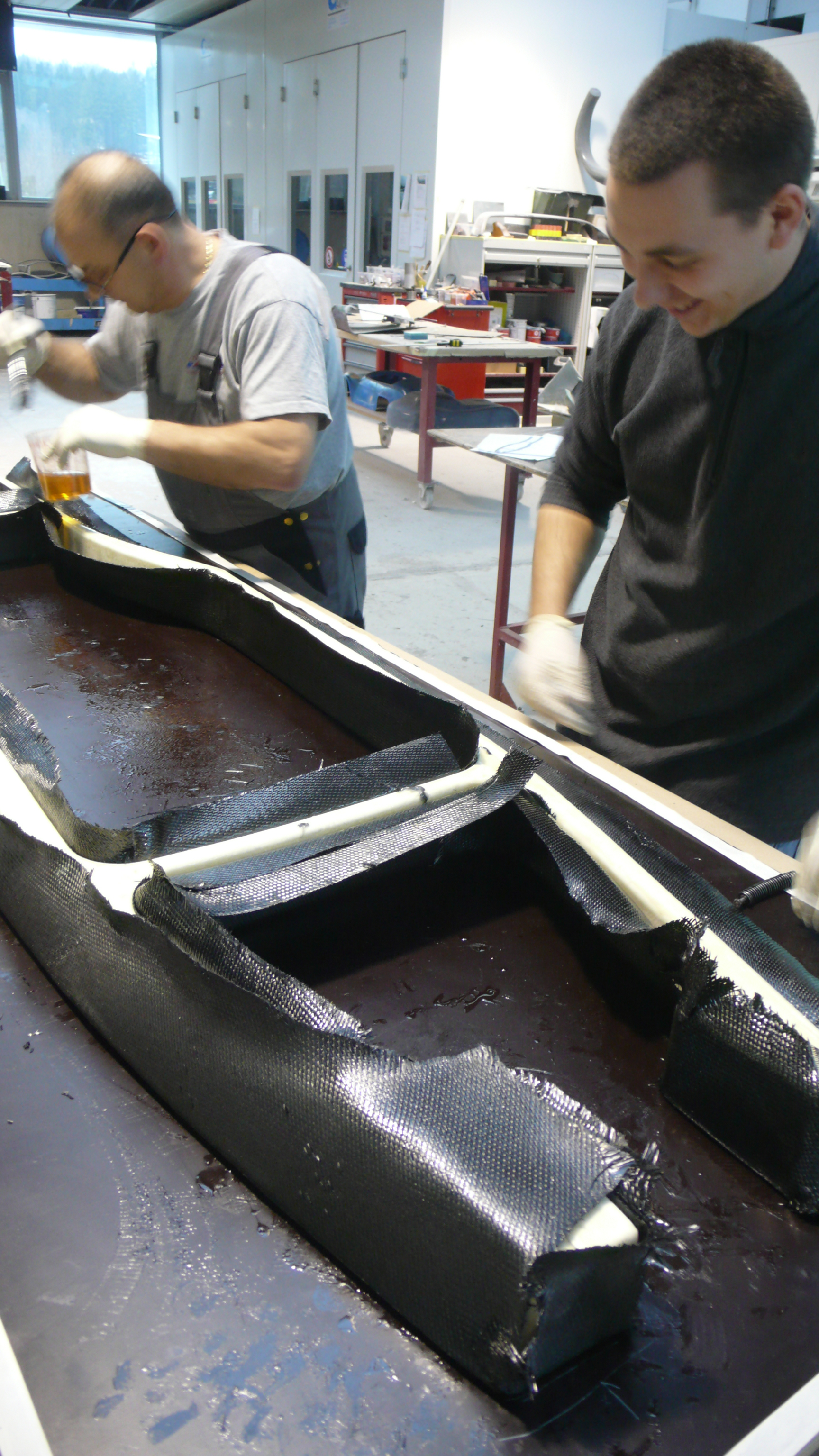 Ces bandes et la mousse sont ensuite enduites de résine. Les bandes appliquées sur la mousse sont recouvertes d’une dernière couche de résine pour s’assurer qu’elles soient bien imprégnées. Il faut finalement les ébuller pour assurer le contact entre la fibre de carbone et la mousse. Le châssis a été d’abord recouvert par le coté haut, de manière à ce qu’il se retrouve sur la planche en bois le soutenant et ainsi donner une surface bien lisse à sa face supérieure.