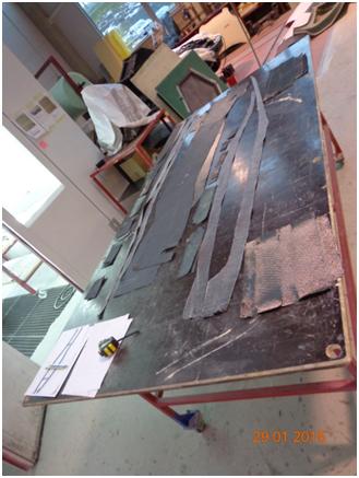 La première étape consiste à préparer les bandes de fibres de carbone. Il faut découper dans le tissu les bandes pour les appliquer correctement sur la mousse, sans oublier divers renforts qui seront positionnés sur le châssis aux points sensibles. Du tissu sergé est choisi pour recouvrir tout le châssis ainsi que les renforts principaux, et un tissu unidirectionnel permet de renforcer le châssis en flexion, sur toute sa longueur.