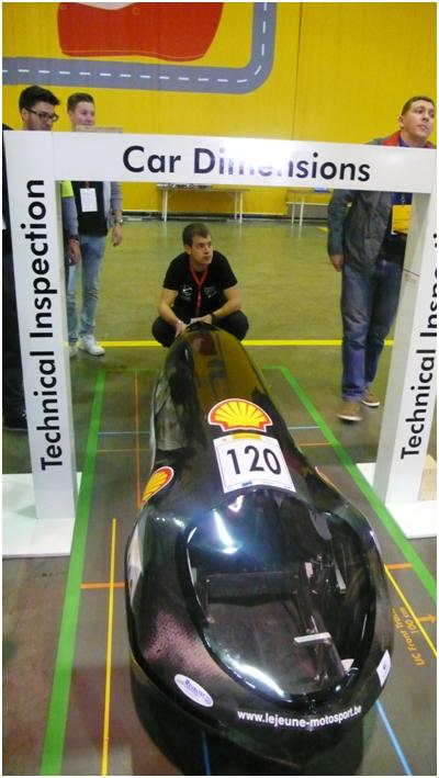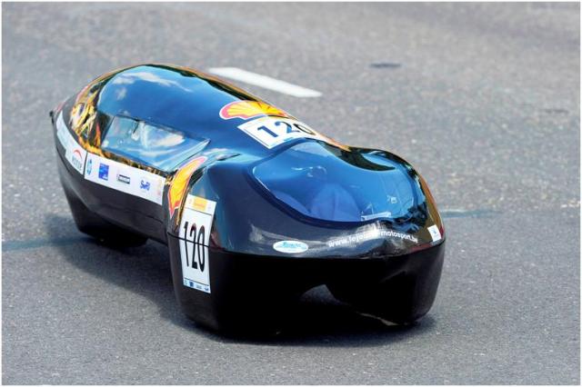 The EcoMotion 5, #120, ethanol prototype, competing for team EcoMotion from Haute Ecole de la Province de Liege, Seraing, Belgium poses for a portrait during practice day 1 of the Shell Eco-marathon Europe 2015 in Rotterdam, Netherlands, Wednesday, May 20, 2015. (Jiri Buller/AP Images for Shell)
