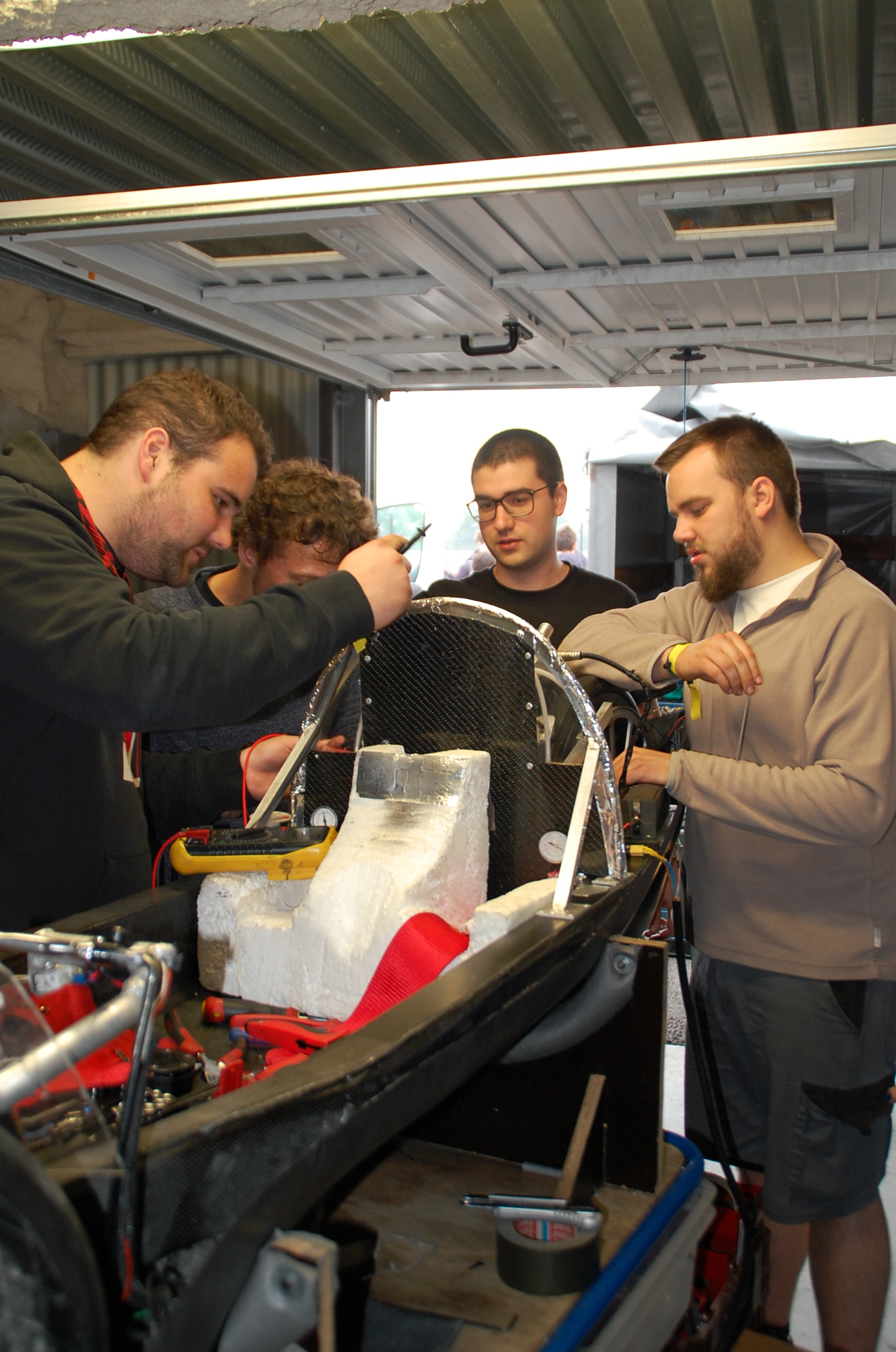 Tout commence par la phase d’intégration. En effet, hormis Sarah, notre pilote, les étudiants de l’équipe présents au Mans, Baptiste, Julien et Guillaume découvraient les éco marathons. Ils participeront fin-juin à l’évènement majeur de la saison, le SHELL éco marathon de Londres, et c’était important qu’ils s’approprient leur proto (et ses caprices).