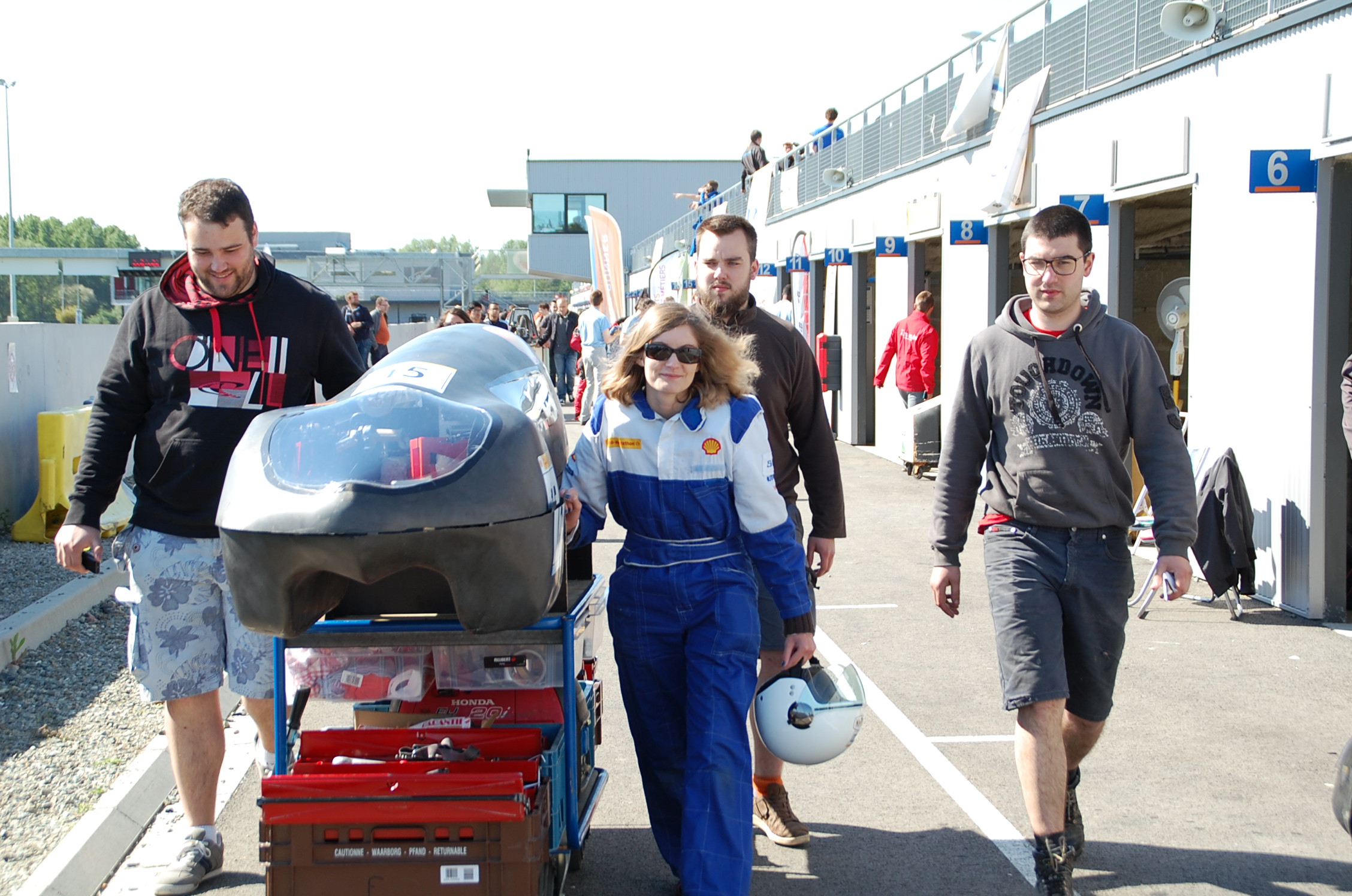 Mais c’est la gestion de crise qui aura consommé la plus grande part de notre temps. SHELL avait préparé pour les 36 équipes présentes un timing faisant la part belle au roulage. Essais le vendredi après-midi et samedi matin. Runs le samedi après-midi, le dimanche matin et après-midi. Notre réalité aura été bien différente. Enfermés dans notre box du vendredi matin jusqu’au dimanche midi à traquer un problème électronique que nous aurons mis plus de 38 heures de travail à cerner, nous n’avons pu mettre le nez dehors qu’au tout dernier moment. Dimanche à 11 heures, il ne reste plus que 3 heures pour tenter de valider un run. Sarah s’élance, et s’arrête après un tour et demi : crevaison. La crise quoi ….