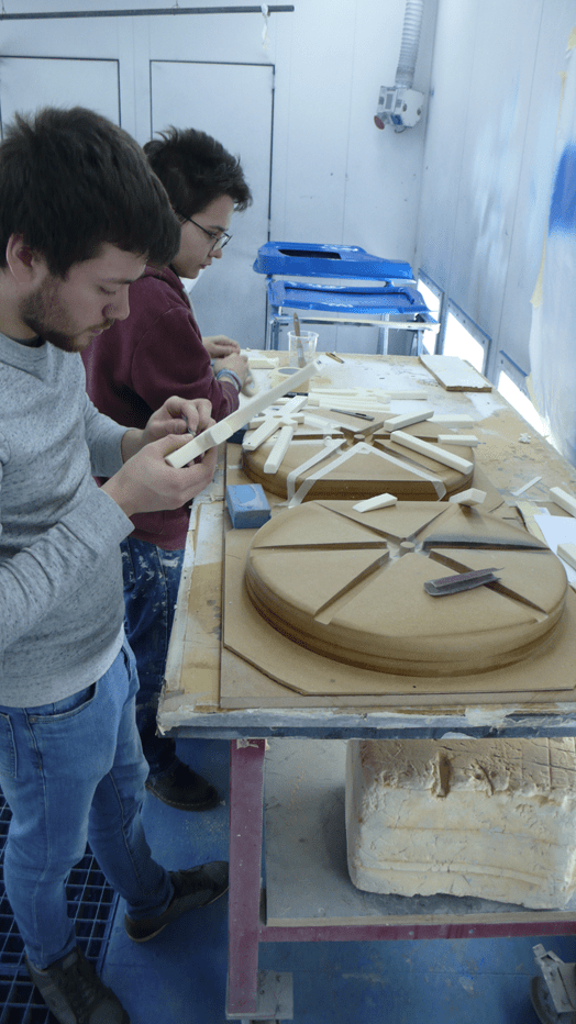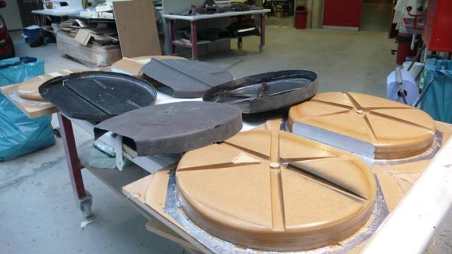 Les quatre moules (Extérieur/Intérieur gauche, Extérieur/Intérieur droit) ont été usinés par notre partenaire http://www.design-stone.com dans des panneaux de MDF. On voit ci-dessous les deux moules extérieurs.